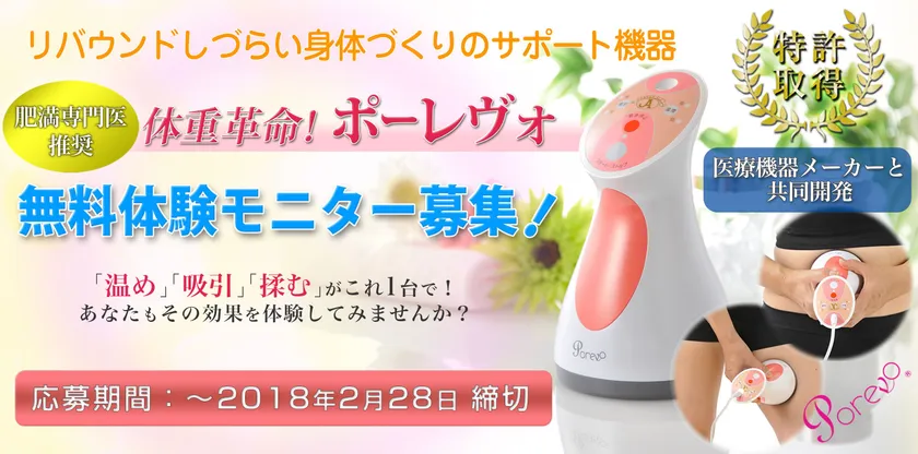健康・美容関連の商品開発、販売を行う株式会社ジャパンオール(本社所在地:東京都中央区、代表取締役:法月 三代子)は、肥満専門医が薦める「温め」「吸引」「揉む」を1台で行えるボディシェイプ美容器『ポーレヴォ』の発売3周年を記念して、体験モニター10名を2018年2月28日(水)まで募集します。また2018年3月31日(土)まで期間限定の割引キャンペーンとして、10,000円引きの特別プライスにて販売します。
