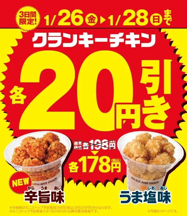 “クランキーチキン”2品が各20円引きで購入できるセールを、2018年1月26日(金)から3日間限定で実施します。