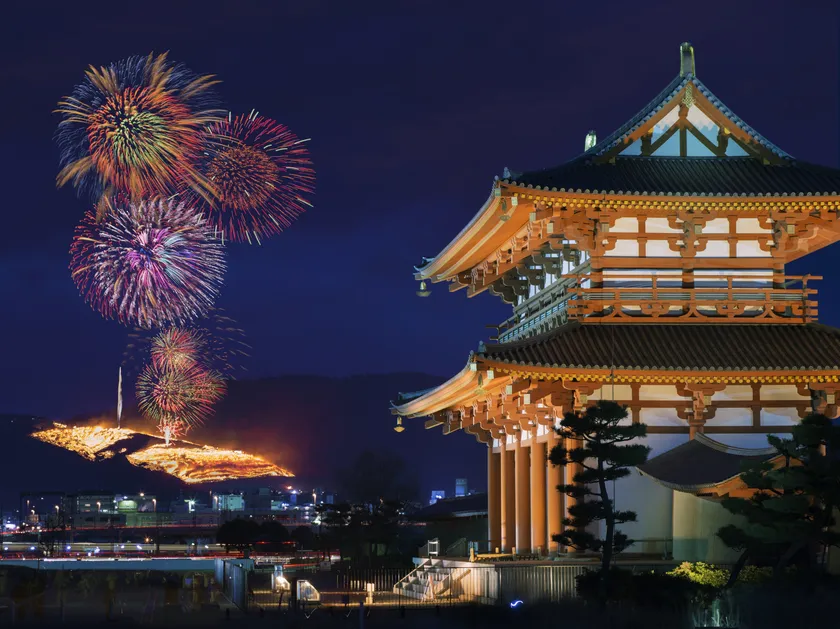平城宮跡 朱雀門と若草山山焼きと花火(c)TAKAHIRO MIYAMOTO/SEBUN PHOTO