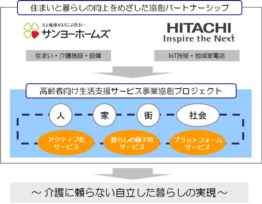 株式会社日立製作所(執行役社長兼CEO:東原 敏昭/以下、日立)とサンヨーホームズ株式会社(代表取締役会長兼CEO:田中 康典/以下、サンヨーホームズ)は、本日、ひとりひとりの暮らしに寄り添ったサービスの提案・展開を通して、住まいと暮らしの向上をめざした生活支援サービス事業において、協創パートナーシップを締結することに合意しました。両社は、人生100年時代における人々のQoL(Quality of Life)向上をめざし、協創の第一弾として「高齢者向け生活支援サービス事業協創プロジェクト」を開始します。