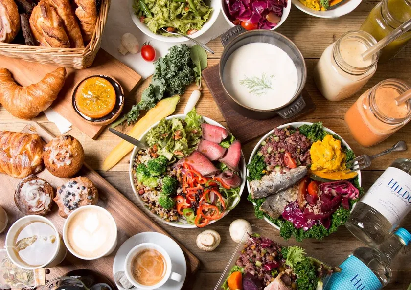 モーニングはコーヒーとクロワッサン、ランチタイムはボリューミーなサラダ&デリをヘルシーに!ディナーは、友人や仕事仲間と夜のカフェタイムをお楽しみいただけます。