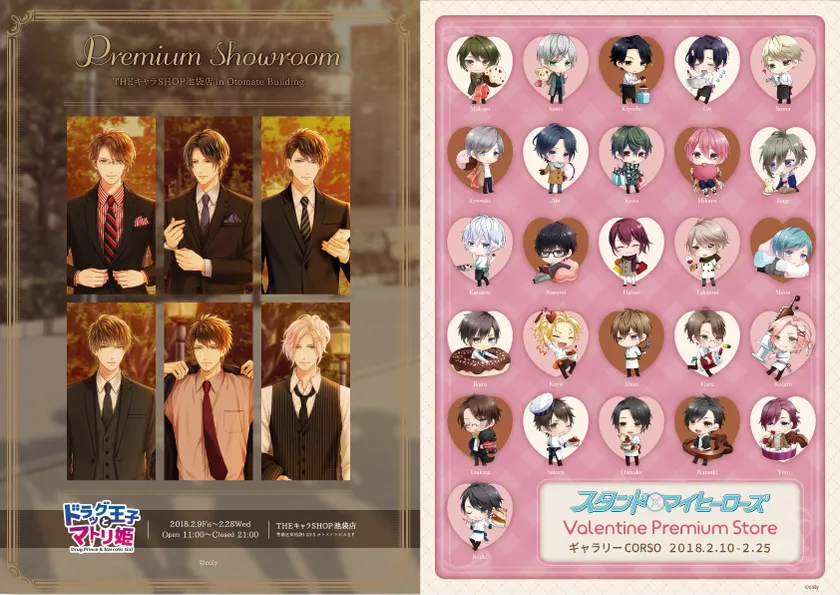 株式会社coly(本社:東京都港区)は、期間限定ショップ《ドラッグ王子とマトリ姫~Premium Showroom~》を2018年2月9日(金)~2月28日(水)に池袋オトメイトビルで、《スタンドマイヒーローズ~Valentine Premium Store~》を2018年2月10日(土)~2月25日(日)に神保町ギャラリーCORSOで開催することをお知らせいたします。