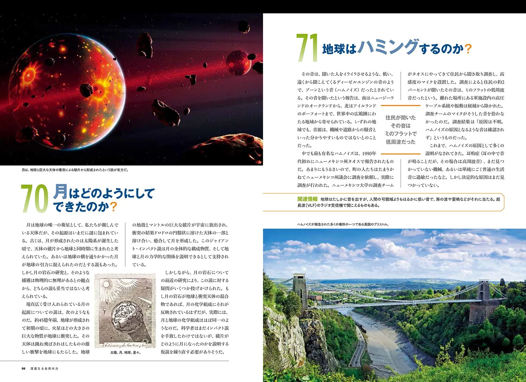 文明の史跡から、「ギザの大ピラミッド」や「ストーンヘンジ」など、今なお解明されていない多くの謎を持つ、歴史的建造物を紹介。自然の力からは、2017年11月に地質年代名称「チバニアン」(千葉県市川市)でも話題となった地磁気の逆転現象に迫ります。