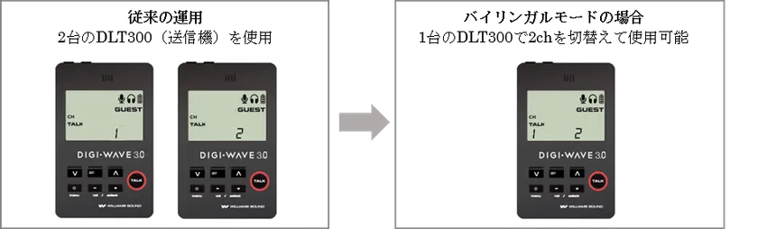 バイリンガルモードは、DLT300にこれまでも備わっていた「同時通訳モード」のサブモードです。1人の通訳者が(1)日本語→英語、(2)英語→日本語のように2chを切り替えて通訳するような用途の場合、これまで2台のDLT300が必要だったところを1台のDLT300で運用できるようになります。