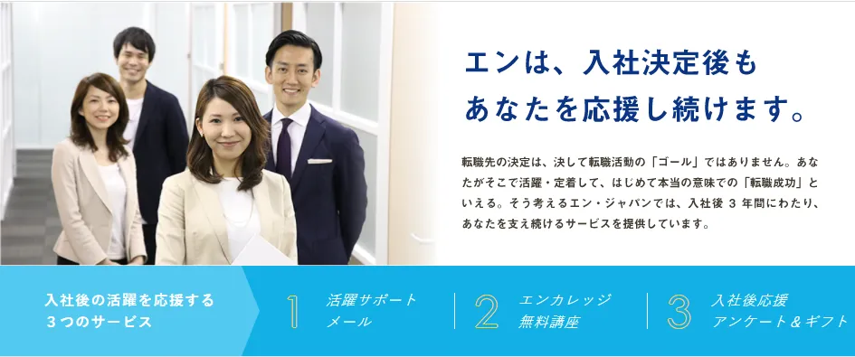 エン・ジャパンは、”入社” がゴールではなく、入社後の会社に馴染んで活躍している姿を転職成功と考えています。転職支援では、求人企業と求職者のミスマッチを防ぐために良いところも、悪いところも正直に伝える姿勢でサービス提供してきました。 2014年から開始した「 エン入社後活躍支援プログラム 」は、求人・転職支援サービス『エン転職』『ミドルの転職』『エン エージェント』『 AMBI 』を通じて入社をされた方を対象に、入社後3年間にわたる継続サポートを実施しています。