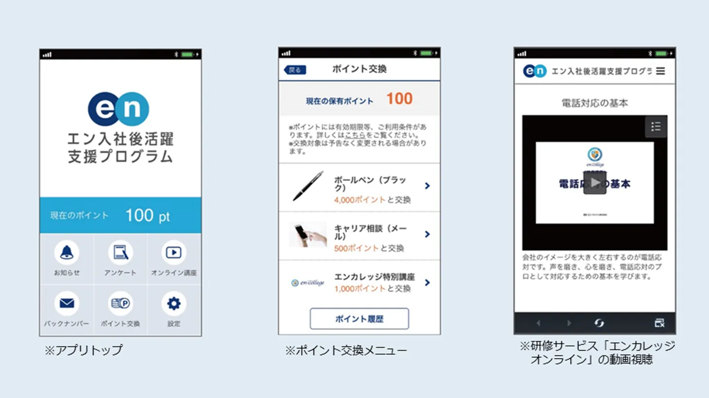 転職先で役立つ情報を盛り込んで定期配信していた「活躍支援サポートメール」や、WEBサイトで公開していたオリジナル動画講座「エンカレッジオンライン」も本アプリ内で利用可能に。加えて入社後の状況に関するアンケートに回答するとポイント獲得ができる「入社後応援アンケート」、獲得ポイントに応じてオンライン研修の受講やメール相談、またはギフトと交換ができる「ポイント交換ギフト」も提供します。本プログラムの利便性と活用率向上により、入社後の活躍支援を強化してまいります。