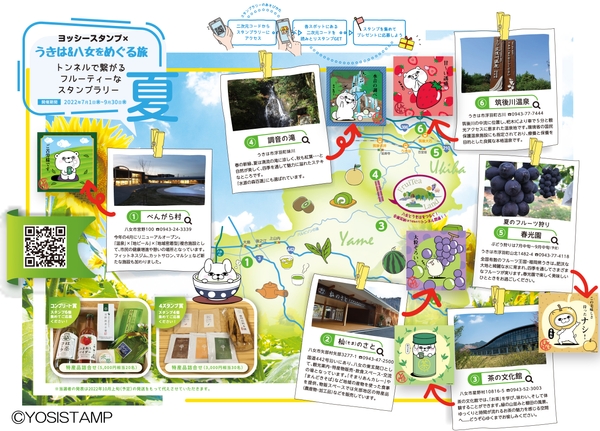 今回、八女市、うきは市にセットされたスタンプラリーポイントには、両市にゆかりのある「お茶」や「フルーツ」などをイメージした「ヨッシースタンプのオリジナルアート」を設置。八女市、うきは市それぞれの観光スポットを回ると特産品が抽選で当たります。