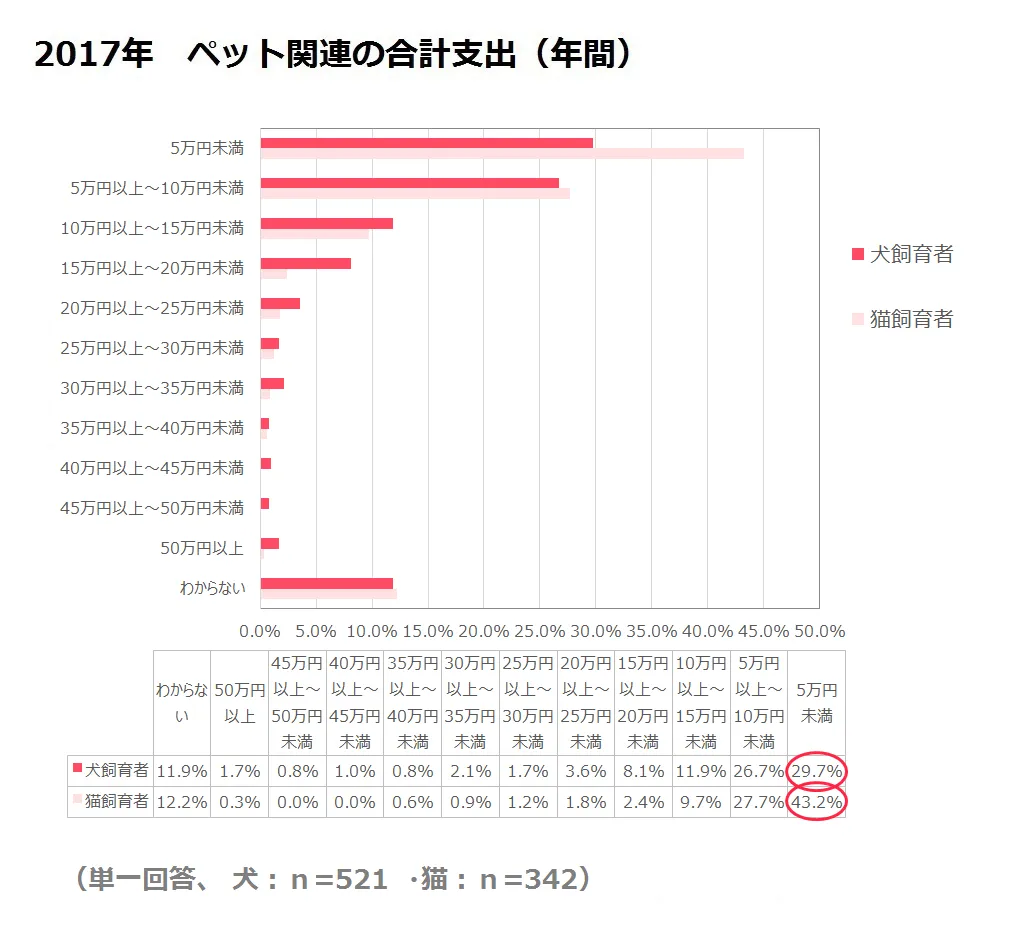 2017年のペット関連支出において、犬飼育者と猫飼育者共に「5万円未満」が最多という結果になりました。ただし、犬飼育者は、「5万円未満」は29.7%、次に「5万円以上~10万円未満」が26.7%とわずかな差となっています。一方で猫飼育者は「5万円未満」は43.2%、次に「5万円以上~10万円未満」が27.7%と犬飼育者と比べ、差を広げる結果となっています。