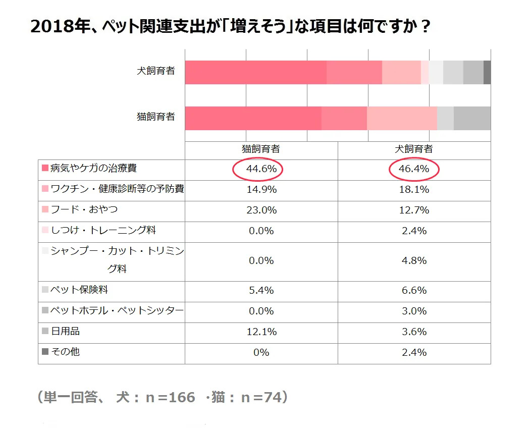 2018年ペット関連支出が「増えそう」と答えた方に、何の支出項目が増えそうかお聞きしたところ、犬飼育者と猫飼育者共に「病気やケガの治療費」という回答が最多となりました。