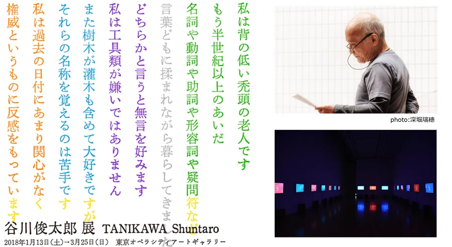 谷川俊太郎は1952年に詩集「二十億光年の孤独」で鮮烈なデビューを果たした後、翻訳、映画の脚本、日本を代表する音楽家との協働などでも知られるように、幅広い仕事によって詩と言葉の可能性を拡げてきました。「谷川俊太郎展」は、谷川俊太郎の現在に焦点を当て、その暮らしの周辺を紹介しています。影響を受けた「もの」や音楽、家族写真、大切な人たちとの書簡、コレクション、自らの撮影による暮らしの映像等を展示しながら、それにまつわる詩を織り交ぜ、谷川俊太郎の詩が生まれる瞬間に触れる試みです。本展のために書き下ろされた詩や、音楽家の小山田圭吾(コーネリアス)とインターフェイスデザイナーの中村勇吾(tha ltd.)とのコラボレーションも展示しています。