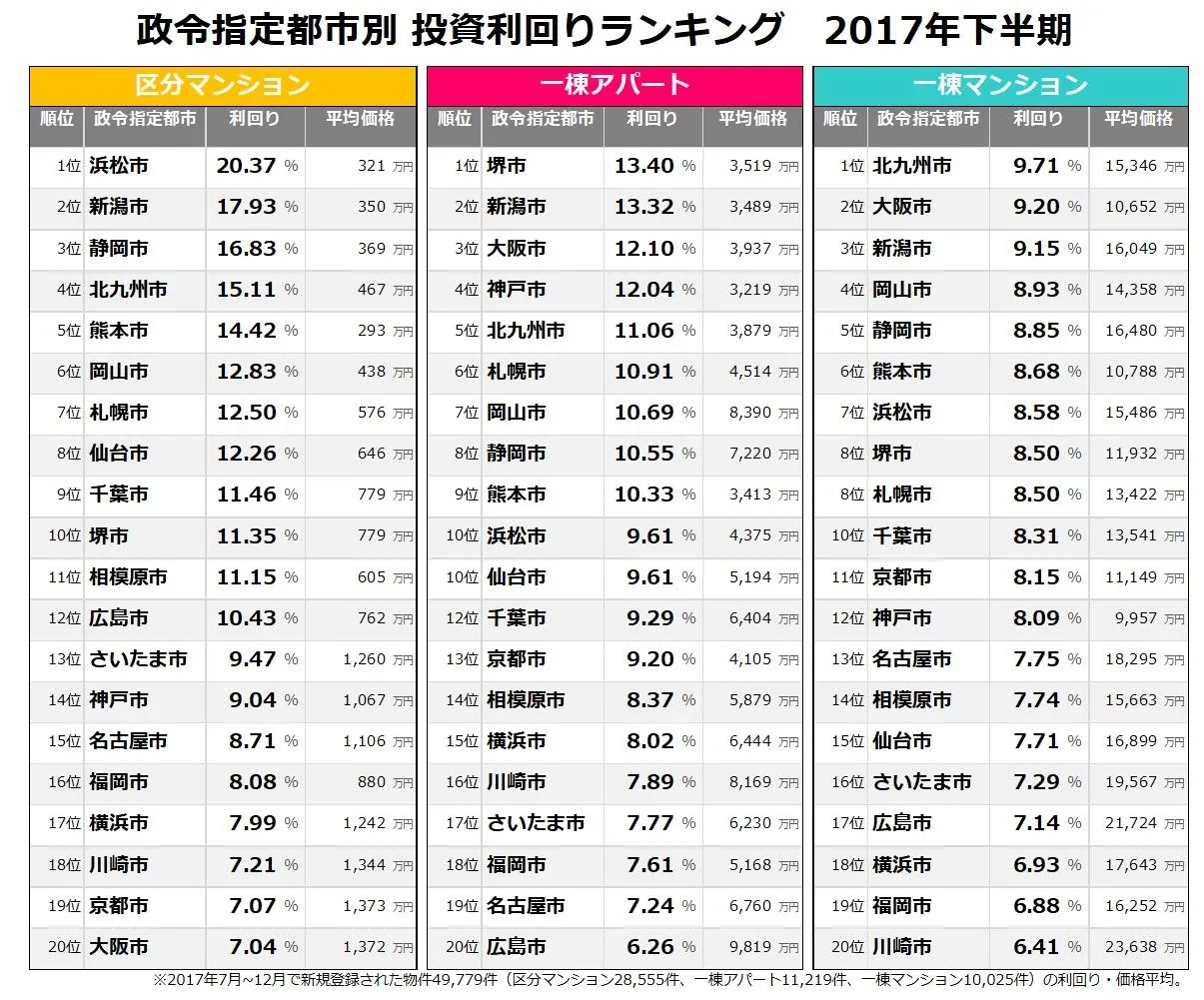 不動産投資と収益物件の情報サイト「健美家(けんびや)」を運営する健美家株式会社(本社:東京都港区、代表取締役社長:倉内敬一)では、同サイトに登録された新規物件を集計し、「政令指定都市別2017年下半期利回り比較」の調査結果をまとめましたのでお知らせいたします。