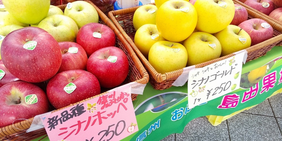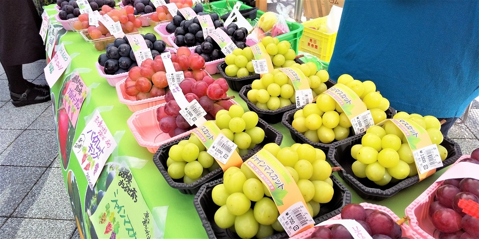 長野県小布施ブースでは、前回に引き続き旬のリンゴやブドウが並びます。