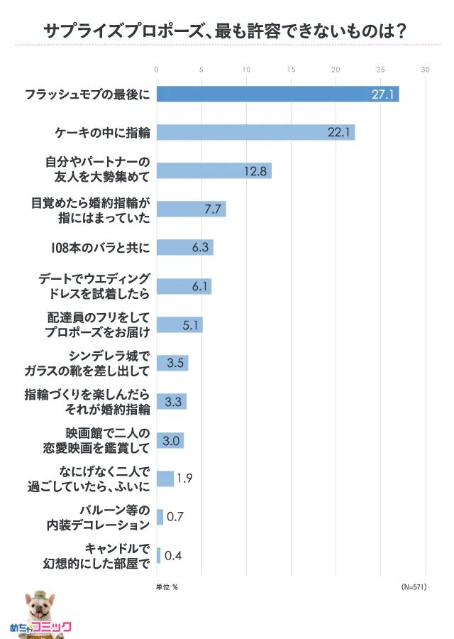 せっかくなら彼女をよろこばせたいと大規模なサプライズを考えている男性も少なからずいます。もし自分がされるとしたら最も許容できないサプライズについて聞いたところ、「フラッシュモブの最後にプロポーズ」(27.1%)と「ケーキの中に指輪」(22.1%)に対し、女性たちが特に拒否反応を示していることがわかりました。他の結果を見ても、危険を感じるものや、周りを巻き込むサプライズは女性から嫌われる可能性大。一方、二人だけのシチュエーションのプロポーズは、女性から受け入れられる可能性が高いようです。