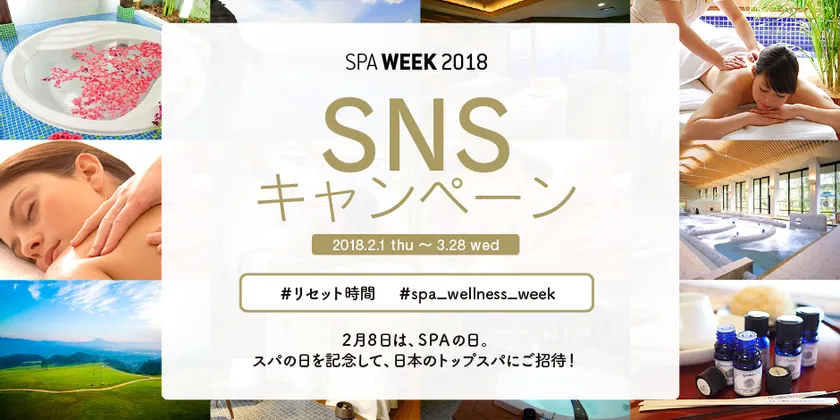 「スパのある暮らしで、もっと美しく!健やかに!」をテーマにリーズナブルな価格で利用できる「スパ&ウエルネスウィーク2018」( http://spaweek.jp/ )を運営している一般社団法人スパ&ウエルネスウィーク(代表理事:岡田友悟)は、2018年2月1日(木)から3月28日(水)まで「SPA WEEK 2018 SNS キャンペーン」を実施します。