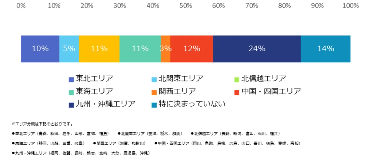 「地方で働くことに興味はありますか?」と伺ったところ、58%の方が「興味がある」と回答。「地方で働くことに興味がある」と回答した方に、具体的に働きたいエリア(※)を尋ねたところ、もっとも人気が高かったのは「九州・沖縄エリア」(24%)でした。「九州・沖縄エリア」と回答した方からは、「アジアのハブになりうる、起業などに積極的」(35歳男性)、「北九州は自動車メーカー、半導体メーカー、他製造業が盛ん。今後更なる規模の拡大が期待できる」(44歳男性)、「産業特区に指定される土地であり、韓国や中国との距離が近くビジネス機会が多く見込めるため」(45歳男性)、「行政もスタートアップ企業に支援が手厚い」(50歳男性)といった声が寄せられました。