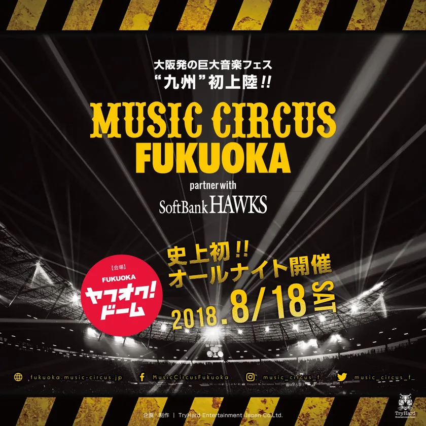 株式会社トライハードエンターテイメントジャパン(所在地:大阪市中央区)と福岡ソフトバンクホークス株式会社(所在地:福岡市中央区)は、音楽フェスティバル「MUSIC CIRCUS FUKUOKA partner with SoftBank HAWKS」(以下、本開催)を2018年8月18日(土)、福岡 ヤフオク!ドーム(以下、本会場)にてオールナイト開催することを発表いたします。