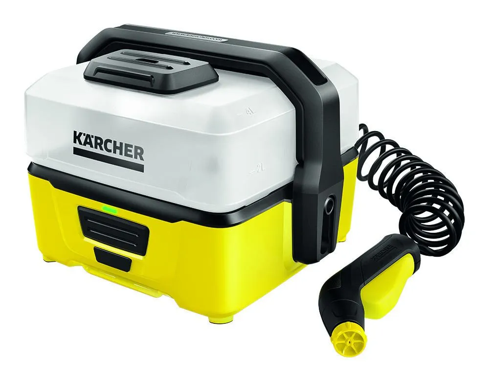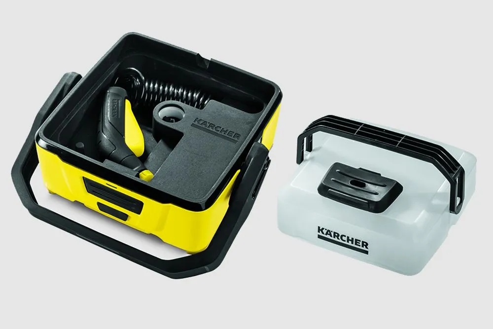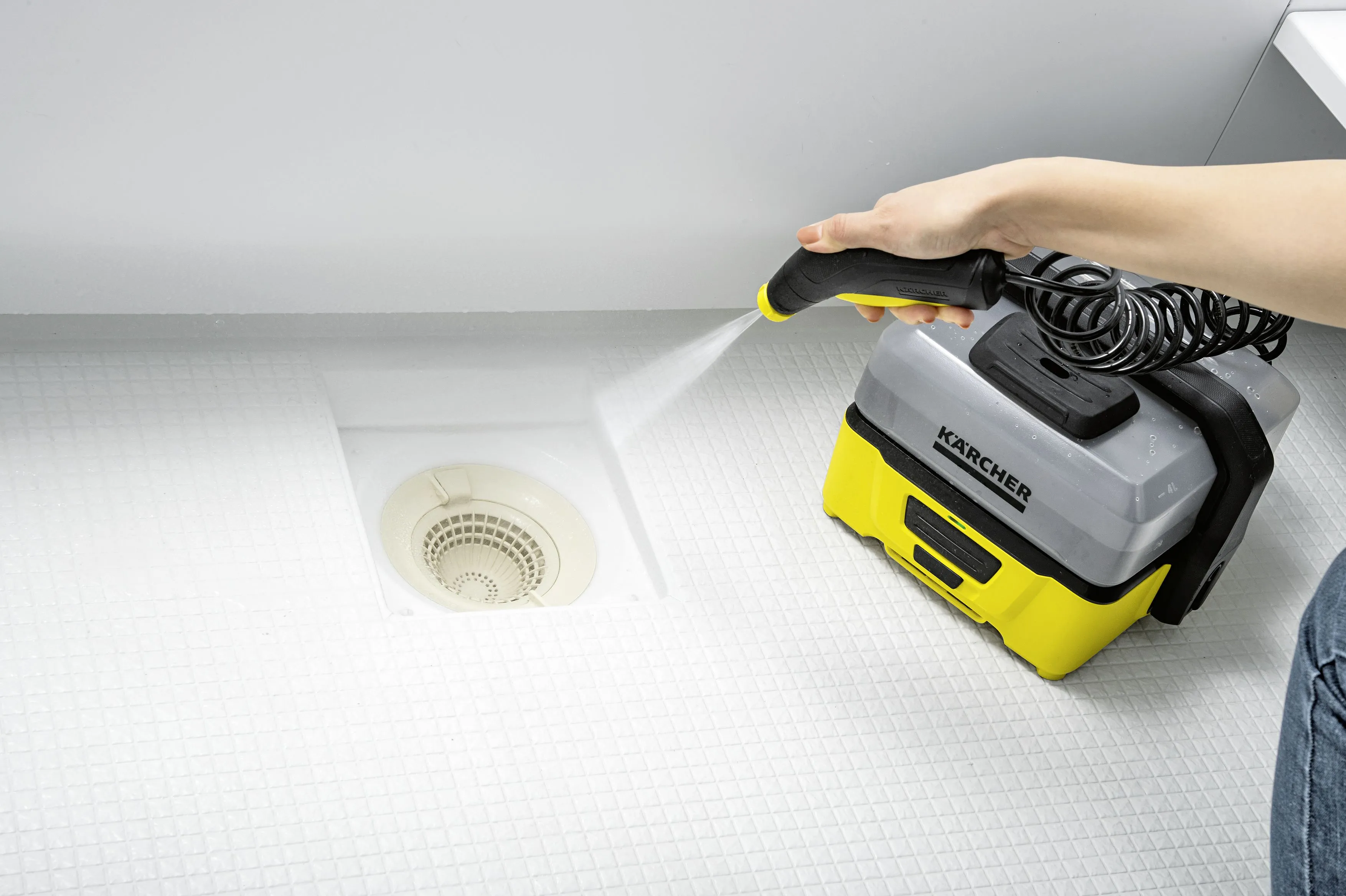 当製品は、ケルヒャー初の給水タンク一体型のバッテリー式家庭用洗浄機で、電源や水源がなくても場所を選ばず気軽に洗浄できます。当社の高圧洗浄機の技術力を活かしたフラットジェットノズルを用いることで、洗浄面に均一に水を当てることができ、低い圧力でも効率よく汚れを落とせます。