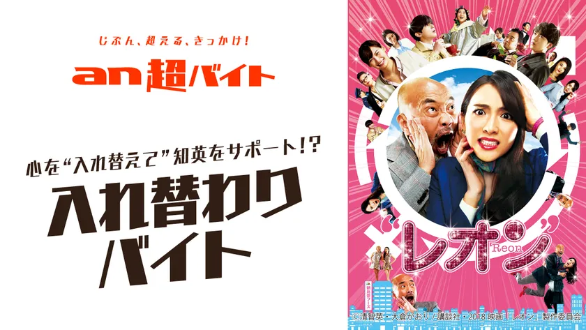 韓国の人気アイドルグループ「KARA」の元メンバー、知英の映画初主演作で、知英扮する地味なOLと竹中直人扮する女好きのワンマン社長の体が入れ替わってしまい騒動を繰り広げる、2018年2月24日(土)公開のコメディ映画『レオン』が「an超バイト」とスペシャルコラボ!映画のストーリーになぞらえて、“入れ替わり”バイトを大募集!入れ替わるのは採用される方本人の“気持ち”!知英が演じるヒロインの小鳥遊玲音(たかなしれお)のようなネガティブ思考を、「克服したい!」「変わりたい!」という強い気持ちをおもちの方からの応募を募ります。