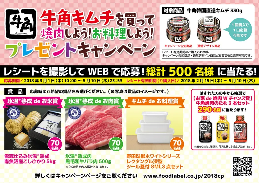 株式会社ピックルスコーポレーション(本社:埼玉県所沢市、代表取締役社長:宮本雅弘)の、連結子会社である株式会社フードレーベルは、2018年3月1日から「牛角キムチを買って焼肉しよう!お料理しよう!プレゼントキャンペーン」を全国で実施いたします。