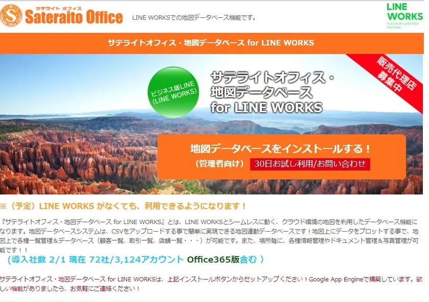 クラウド環境、サテライト環境でのビジネス支援に特化したインターネットシステムソリューションベンダーである株式会社サテライトオフィス(本社:東京都江東区、代表取締役社長:原口 豊 http://www.sateraito.jp/ )は、ビジネス版LINE「LINE WORKS」導入企業向けに、LINE WORKSとシームレスに動く、クラウド環境の地図を利用したサテライトオフィス・地図データベースfor LINE WORKSを開発し、提供開始したことを発表します。