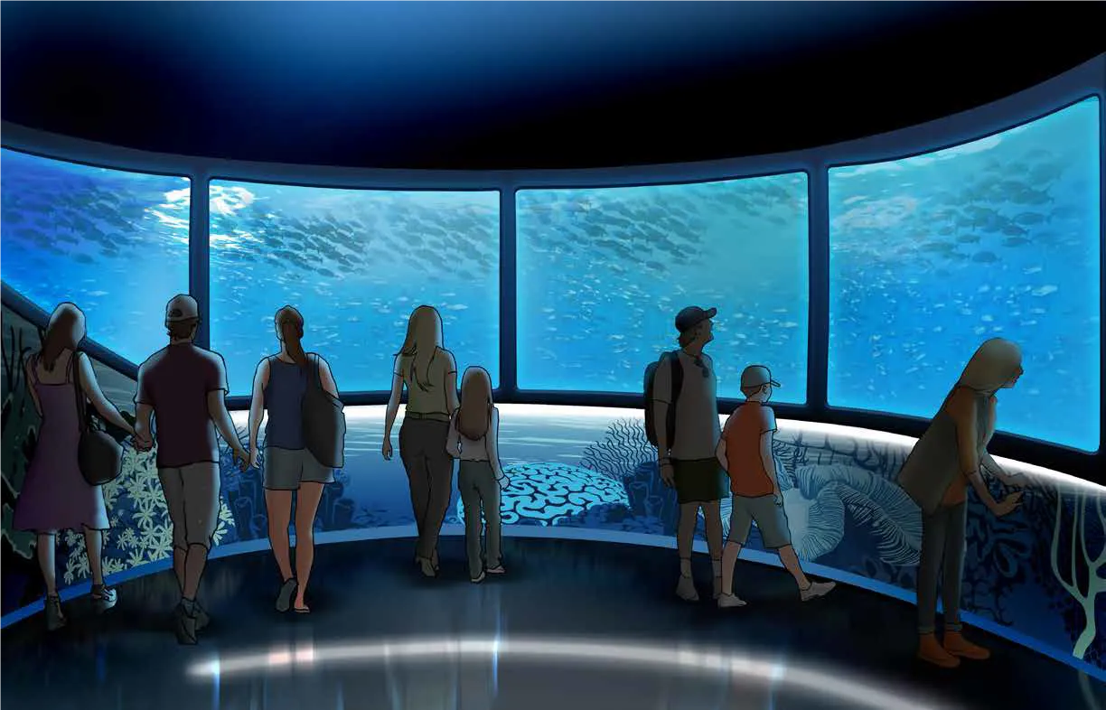 360度囲まれた水槽を魚が群れとなって泳ぎ、まるで海の中にいるような体験をお楽しみいただけます。