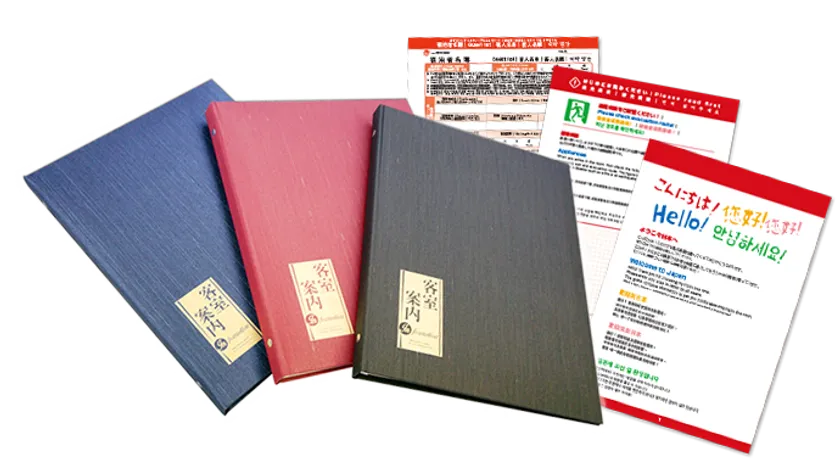 住宅宿泊事業法で求められる宿泊者名簿や、トイレ・給湯器などの文化の異なる外国人旅行者が戸惑う宿泊施設の使い方を記載したハウスマニュアル、騒音・ゴミの処理等の宿泊マナーを記載したハウスルールといった必要な書類を“客室案内”の体裁で高級ファイルにセットして、民泊の運営をサポートいたします。