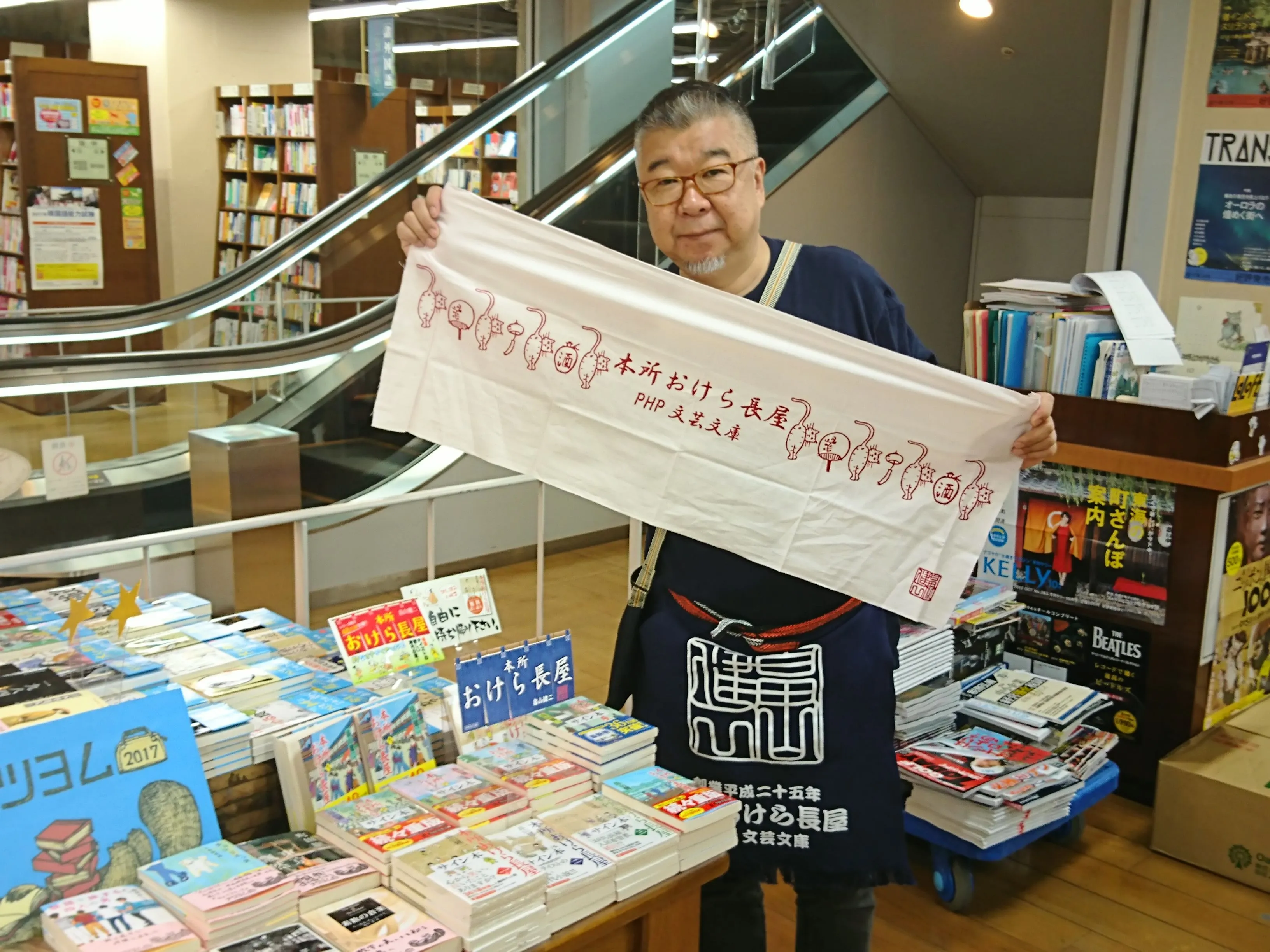 書店訪問時は「手ぬぐい」や「千社札」などのグッズ持参。著者の軽妙トークで売り場に笑いと活気を届けるこのキャラバンは、今や「おけら長屋シリーズ」の名物です。半年に一度の巡回を心待ちにする書店員もいるほど、おなじみの企画になっています。