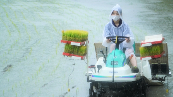 大阪国際大学・大阪国際大学短期大学部の学生が、水田に緑の絨毯を敷く田植えを行いました。