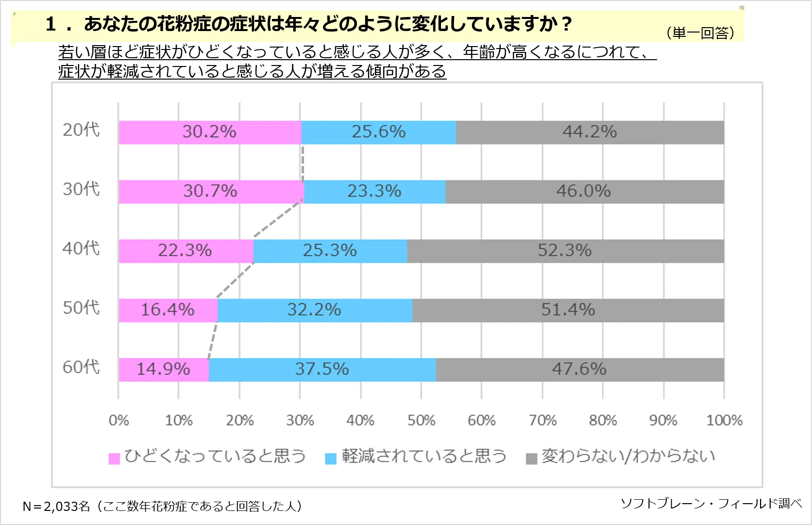・花粉症による症状の変化は、若者と年配の方の間で大きな差がみられ、若い層ほど症状がひどくなっていると感じる人が多く、年齢が高くなるにつれて、症状が軽減されていると感じる人が増える傾向がある。