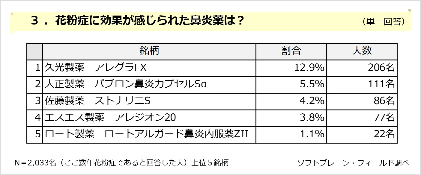 花粉症に効果が感じられた鼻炎薬は、1位が「久光製薬 アレグラFX」が12.9%で、「医療用と同じ成分で飲んですぐ効き目がわかる事と、副作用もなく、もう数年飲み続けている(30代男性)」など、医療用と同じ成分である安心感や、確かな効き目が多くの方の支持を集めた。2位は「大正製薬 パブロン鼻炎カプセルSa」が5.5%で、「鼻水が止まらない花粉症に効く(20代女性)」など、つらい鼻水を伴う花粉症に効果的であるという声が多かった。3位「佐藤製薬 ストナリニS」が4.2%で、「1日1錠のうたい文句に嘘はなく、つらい花粉症でも実際に1日持つことが分かっていること、確実な効き目がある(40代男性)」など、1日1回の手軽さと効き目の持続性で選ばれている。