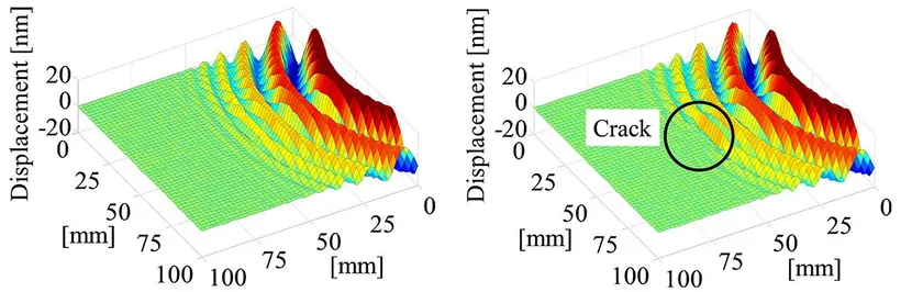 構造物の表面に高出力のパルスレーザーを照射することで生成された、数十ナノメートル程度の弾性波の伝播を計測することで、構造物の損傷を非接触かつピンポイントで確認することが可能となります。
