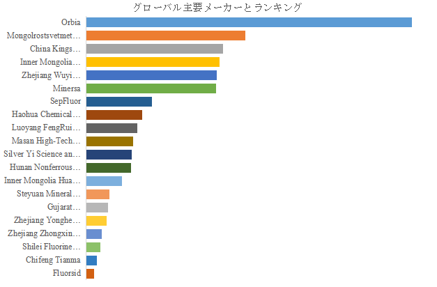 LP Informationのトップ企業研究センターによると、蛍石の世界的な主要製造業者には、Orbia、Mongolrostsvetmet SOE、China Kings Resources Group、Inner Mongolia Baotou Steel Union、Zhejiang Wuyi Shenlong Flotation、Minersa、SepFluor、Haohua Chemical Science & Technology、Luoyang FengRui Fluorine、Masan High-Tech Materialsなどが含まれている。2024年、世界のトップ5企業は売上の観点から約26.0%の市場シェアを持っていた。