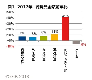 ・ 2017年の玩具は金額前年比7%増。主要分類がいずれも販売を伸ばす。