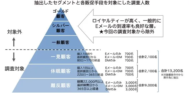 調査内容:購買実績を基に3つにセグメントしたEC会員に対して、DMとEメールを活