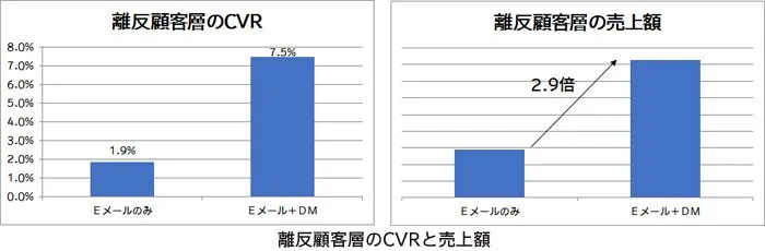 特にEメール到達率が低い離反顧客層では、顕著な効果が見られ、CVRは実に「Eメールのみ」の3.9倍に達し、売上金額も2.9倍に増加する結果となりました。