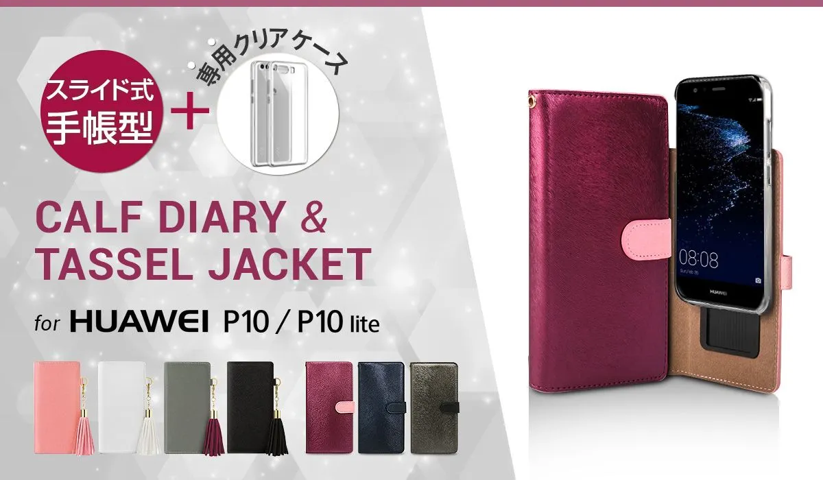 本製品は、P10 / P10 lite専用のクリアケースが付属し、粘着タイプのスライド式で裏側にカメラホールがなく、スッキリしたデザインの手帳型ケースです。HANSMARE(ハンスマレ)から「CALF Diary(ハンスマレ カーフダイアリー)」DreamPlus(ドリームプラス)から「Tassel Jacket(タッセルジャケット)」の2種が登場しました。 公式オンラインショップ(http://www.mycase.jp)にて販売中です。