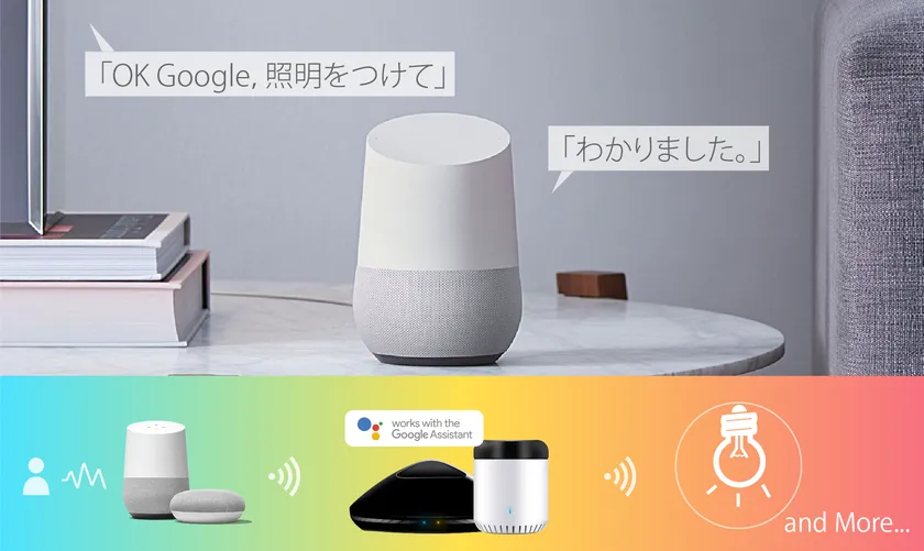 ※2 Google社が用意している標準の「スマートホームアクション」を採用しています。「スマートホームアクション」では、現時点(2018年2月14日時点)照明のみ対応ですが、eRemoteシリーズアプリ「eHome」の照明ボタンにテレビやエアコンなどの信号を記憶させれば、理論上すべての赤外線家電の電源を制御できます。今後、Google Homeは照明以外の家電も標準対応する予定となっており、リンクジャパンも随時対応していきます。