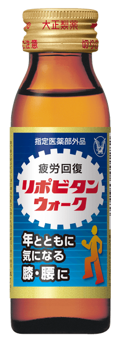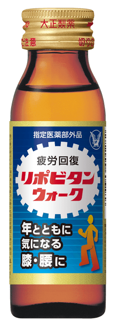 『リポビタンウォーク』は、「疲労回復」をサポートする成分タウリン、ビタミンB群(B1・B2・B6)に加え、「加齢に伴う膝腰の不調の改善・予防」をサポートする成分コンドロイチン、カルシウムと、丈夫な体を維持するのに必要な必須アミノ酸(BCAA※2)を配合した50mLミニドリンク剤(指定医薬部外品)です。