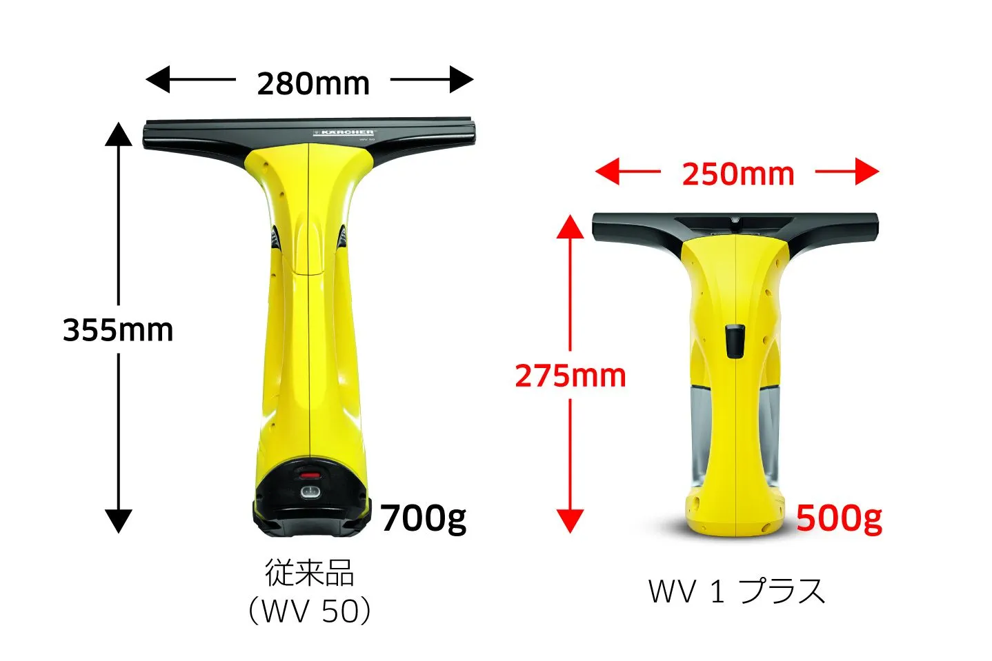 『WV 1 プラス』『WV 1 プレミアム』はより使いやすくなった新モデルで、従来製品の「WV 50 plus」「WV 75 plus」に比べ、重さが約200g軽く、サイズもコンパクトになりました。さらに、ハンドル部分の形状も持ちやすく改良。これまで以上に窓掃除が楽になります。また、作動音が低くなったことで静音性も向上し、周囲に気兼ねなくお使いいただけます。