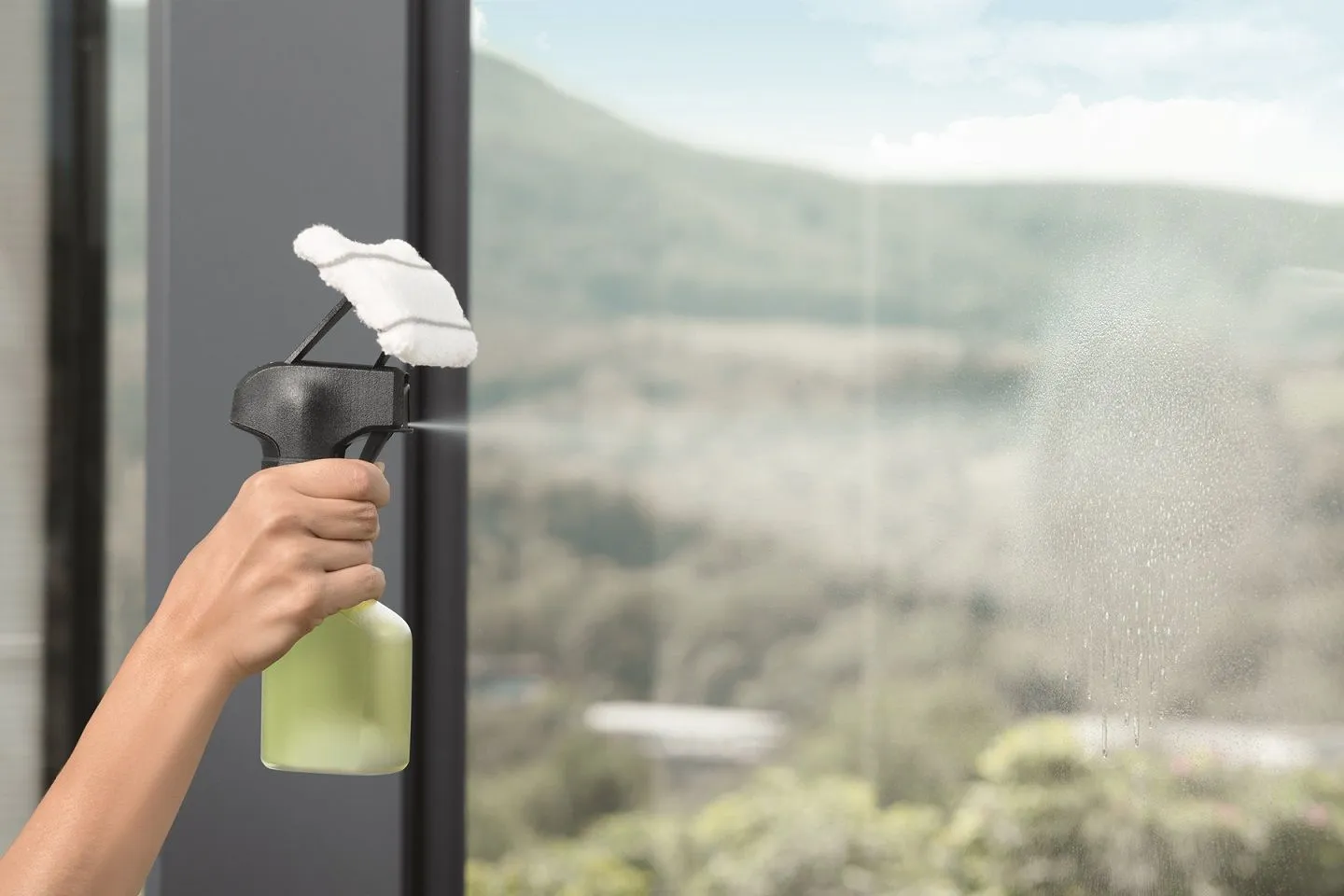 1.スプレーボトルで専用洗浄液を窓ガラスに吹きかける