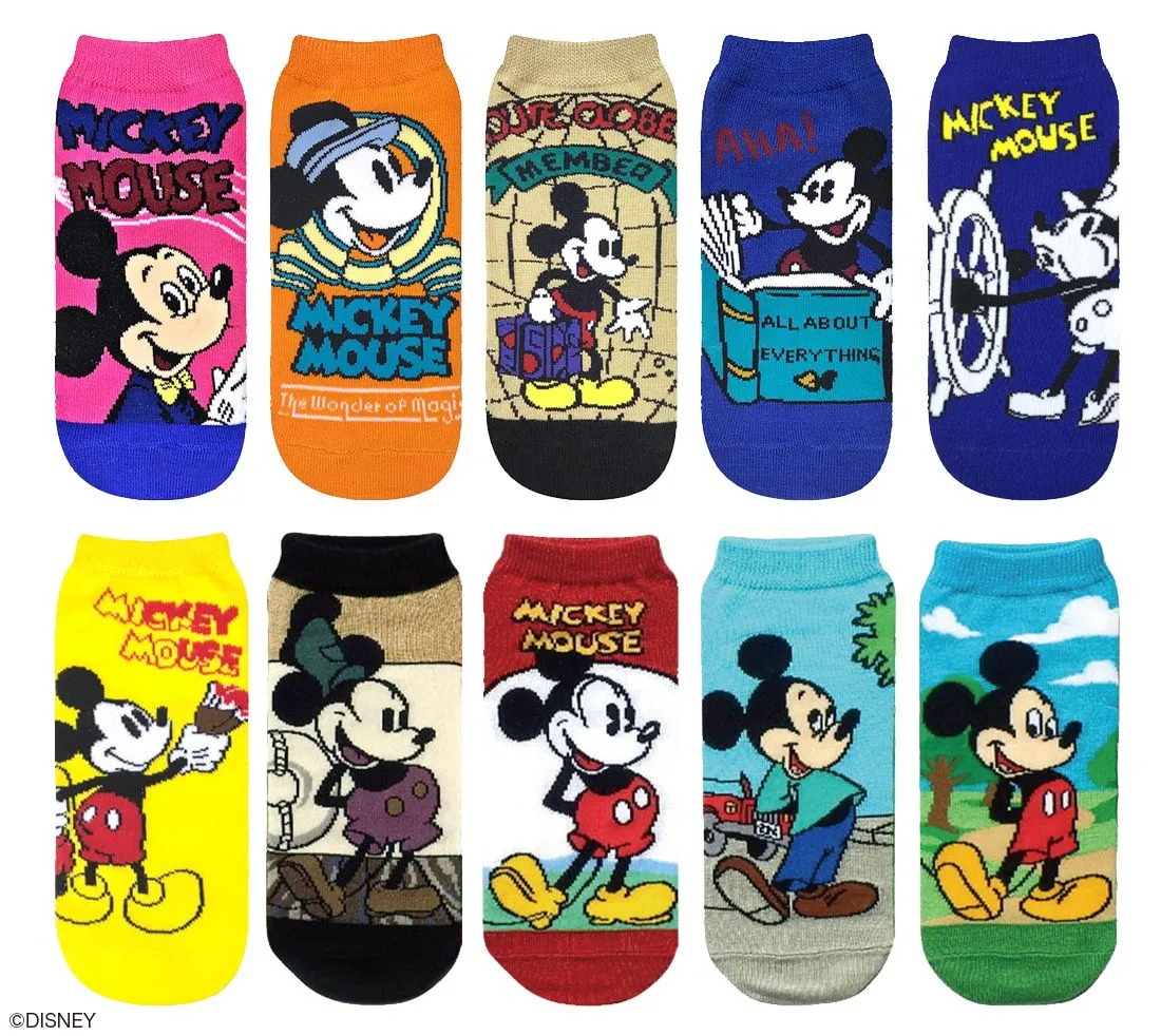 読書したり、カンカン帽でおめかししたミッキーがクラシックテイストなデザインや、「蒸気船ウィリー」など初期の短編映画をモチーフにしたデザインなど、様々な年代の作品に登場するミッキーが楽しめるスニーカー丈ソックス。