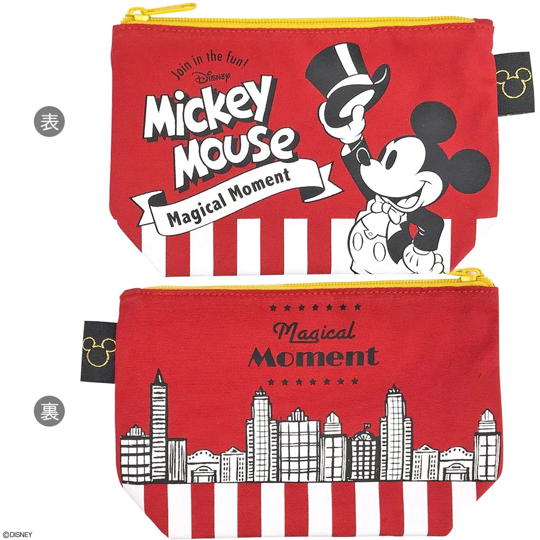 シルクハットにタキシードでオシャレに決めたミッキーをデザインした<魔法の瞬間>は、えんじ色の生地が一層クラシカルなテイストを引き立たせています。裏面はきらびやかなビルや建物をデザイン。