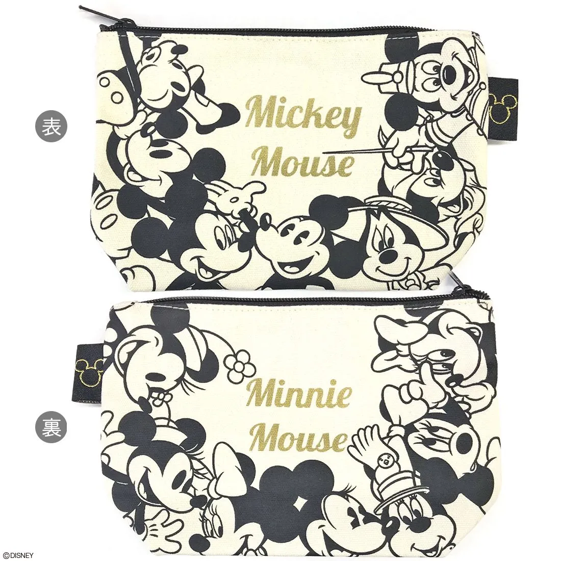 色々な表情のミッキーを楽しめる<ヒストリー>は、歴代作品に登場するミッキーがポーチの周りをぐるっと囲んだにぎやかなデザイン。裏面は、歴代のミニーになっています。モノトーンの落ち着いたイラストの中に、ゴールドのロゴがアクセントになっています。