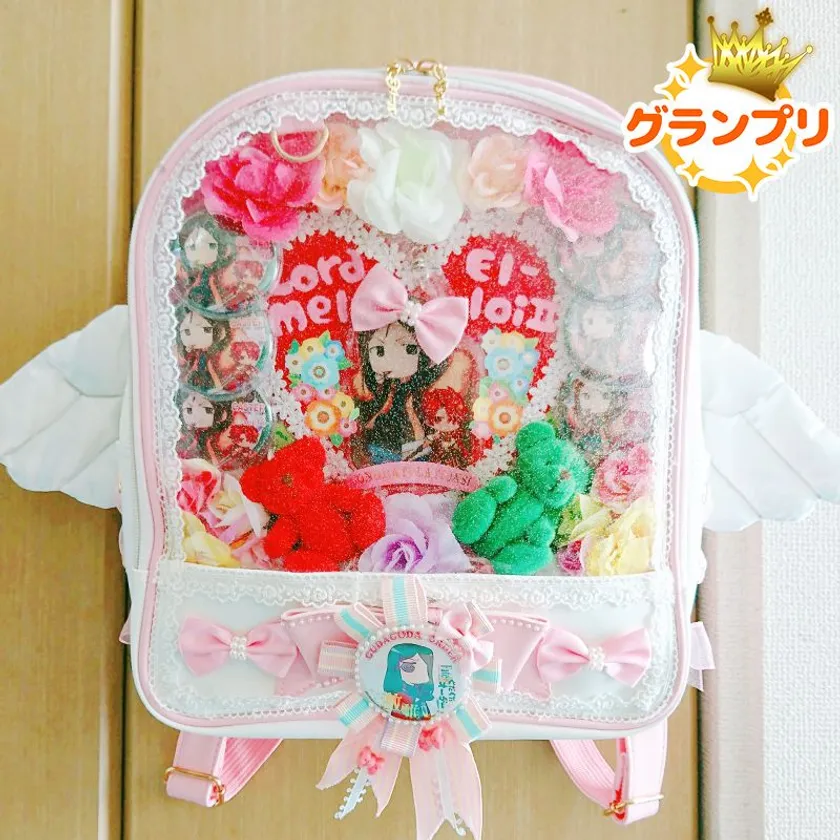 市販されているカバンやリュック類に、お気に入りキャラクターのグッズ類を飾り付け、対象への愛の深さを具現化したアイテムです。現在ではオタクの間に広く認知されており、また、その人気から、透明ビニール製のカバンや、小窓の付いたリュック等、痛バッグの作成に特化した製品が発売されるに至っています。
