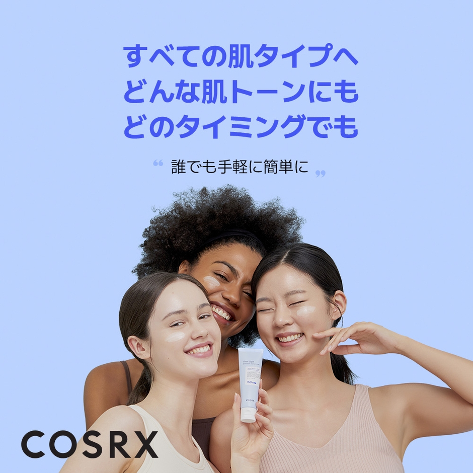 全ての肌タイプ、スキントーンにかかわらず気軽に使用できるCOSRXの「ウルトラライト透明UVクリーム」で、蒸し暑い夏でもしっかり紫外線対策を!洗顔後、次のステップに「RXザ・6ペプチドスキンブースターセラム」をご使用頂き、最後のステップとして「ウルトラライト透明UVクリーム」をご使用いただく事で、よりしっとりと艶やかに夏の火照ったお肌をケアすることが出来ます。