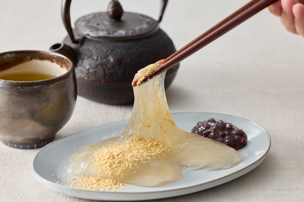 和菓子になじみのない方でも気軽に楽しめる、新しい形のわらび餅として開発されました。なめらかで繊細な口当たりは甘さを控えめに調整し、お子様からご年配の方まで幅広い世代に愛される上品な味わいに仕上げています。和菓子本来の風味を大切にしながらも、現代の食の好みに合わせた絶妙なバランスを追求しました。さらに、抹茶や黒蜜、きなこなどの伝統的な和の素材との相性も抜群で、お好みのトッピングや組み合わせを楽しみながら、あなただけの特別な味わい方を見つけられるのも大きな魅力の一つとなっています。