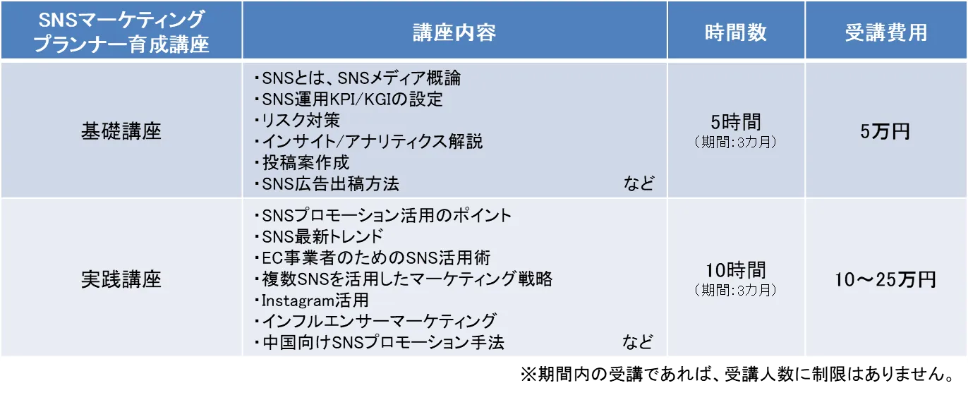 受講内容は、当社がこれまでに4,000社以上のSNSマーケティング支援を手がけてきた実績を活かし、FacebookやTwitter、Instagram、LINEなどの主要なSNSを中心に、一定水準のマーケティング業務に対応するために必要な基礎知識や応用テクニックを解説する内容で実施してまいります。企業向けのSNS研修はリスク対策に着目した内容が多く、SNSに企業が取り組むことのメリットや方法論についての研修を提供する企業が少ないことを業界全体の課題と捉え、研修・講座の開発を進めてまいりました。本講座の提供によって、リスク対策だけでなく、正しい知識による積極的なマーケティング活用を行う企業が増え、SNSマーケティング市場が活発化することを期待しています。