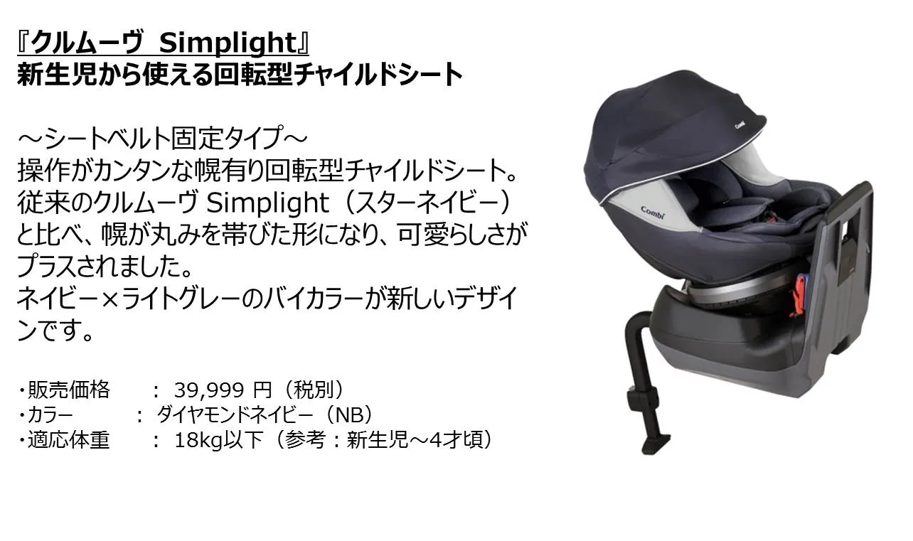今回は『Simplight』シリーズとして初めて、ISOFIX固定タイプの回転型チャイルドシート「クルムーヴ ISOFIX Simplight」を発売。併せて、シートベルト固定タイプの「クルムーヴ Simplight」も同時発売致します。