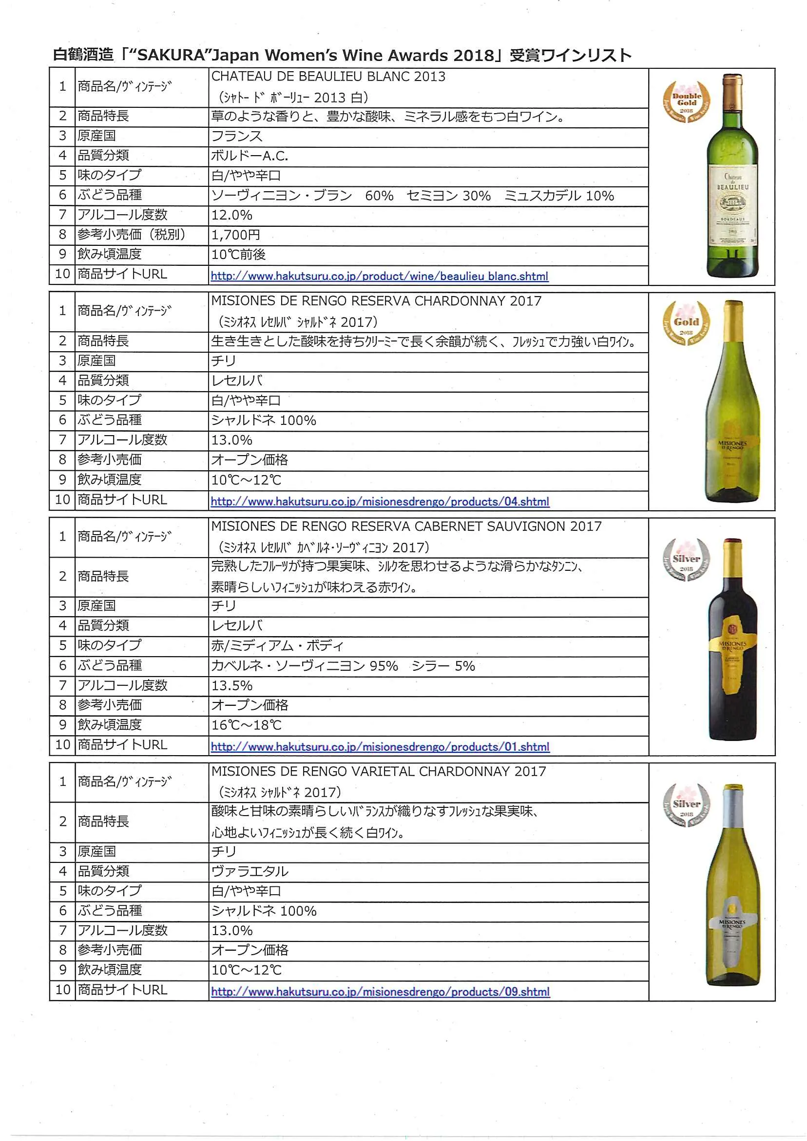 白鶴酒造株式会社(本社:神戸市、代表取締役社長:嘉納健二、資本金:4億9,500万円)は、「“SAKURA” Japan Women’s Wine Awards 2018」(※)にて「CHATEAU DE BEAULIEU BLANC(フランス)」でダブルゴールド、「MISIONES DE RENGO RESERVA CHARDONNAY(チリ)」でゴールド、「MISIONES DE RENGO RESERVA CABERNET SAUVIGNON(チリ)」「MISIONES DE RENGO VARIETAL CHARDONNAY(チリ)」の2商品でシルバーを受賞いたしました。