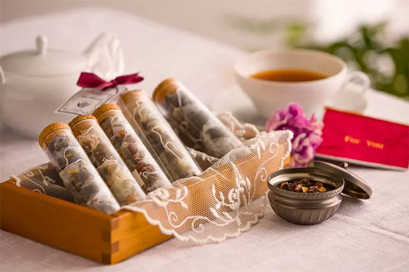 花々や植物、果実で装飾された美しい紅茶を1つ1つ小さなガラスの小瓶に詰めました。封を開けたときに広がる香りは、香水のように繊細で華やか。